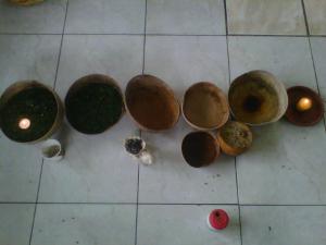 ENCIENDA LAS DOS VELAS,PRIMERO LA BLANCA Y COLOQUE COMO SE VE EN LA FOTO LAS AGUAS EN ESTE ORDEN:MENTA,QUEREME,CANELA,AGUA BENDITA Y AGUA DE RIO,MIEL DE ABEJA Y MIEL DE CAÑA,AGUA CON PERFUME,EL JUGO DE LA MANDARINA,Y LA VELA AMARILLA ENCENDIDA.