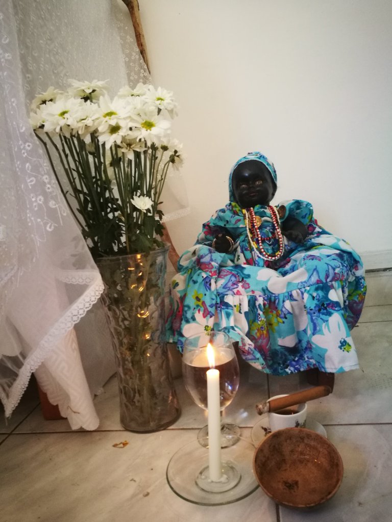 Y no siempre lo hago, cuando regreso, les digo así mismo de forma informal «ya llegué», y no siempre lo hago, sin embargo si voy a viajar fuera de donde vivo y no regreso a casa ese día o por varios días, si le explico a Yemayá y le toco la maraca, y dos veces al mes o a veces una sola vez, los atiendo a todos,y les hablo, pero esa soy yo.
